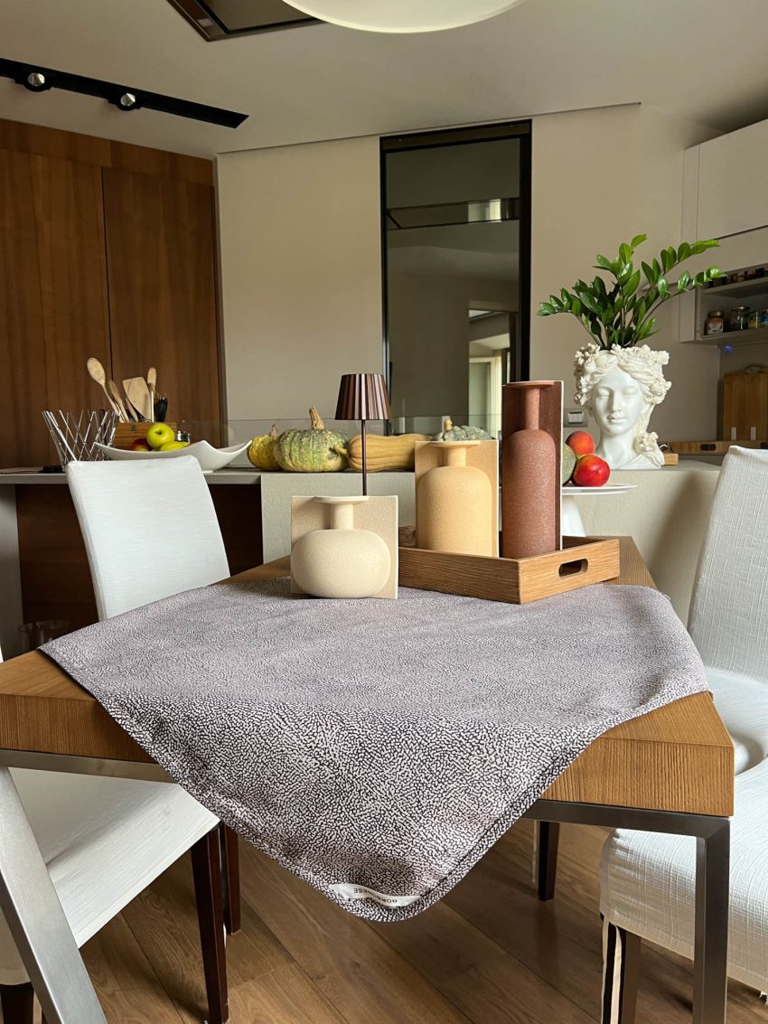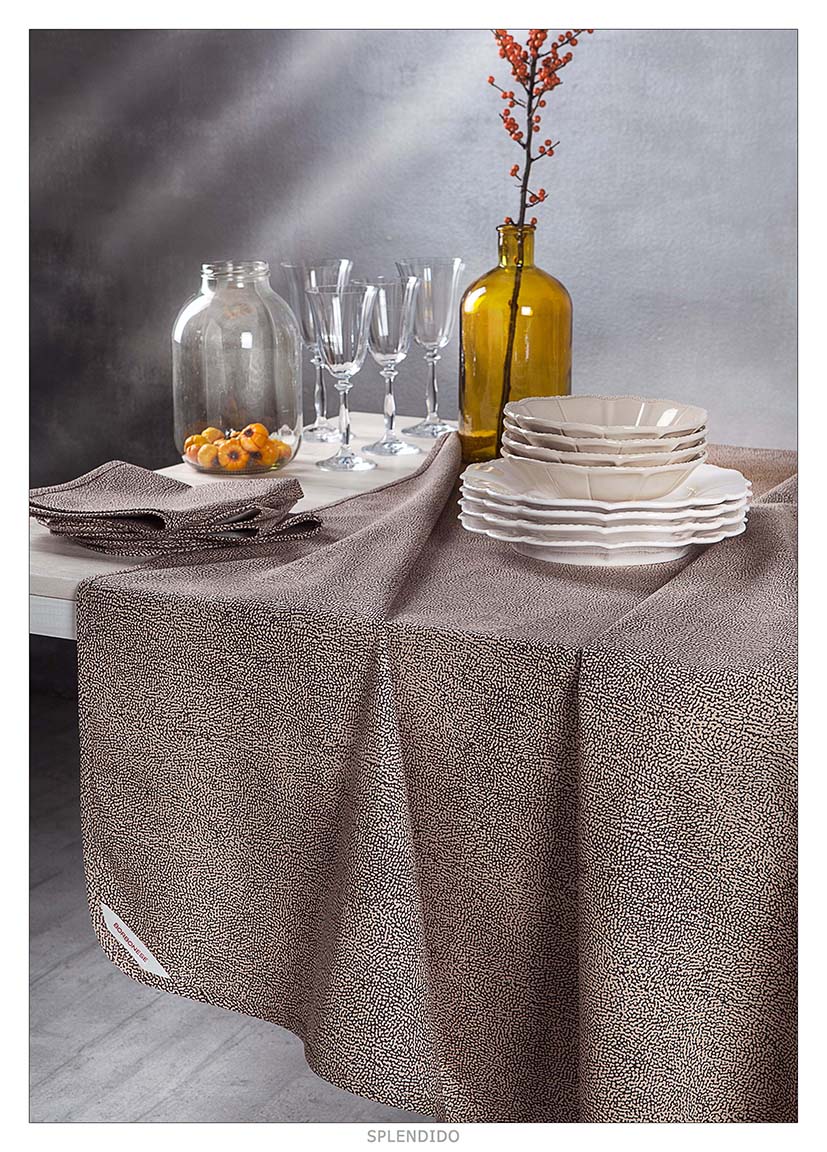 Servizio tavola colore beige in panama di puro cotone con tovaglioli. Tovaglia sbiecata stampata fantasia occhio di pernice.Lavabile in lavatrice.