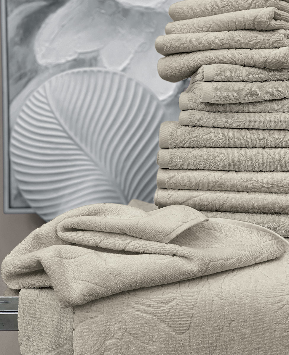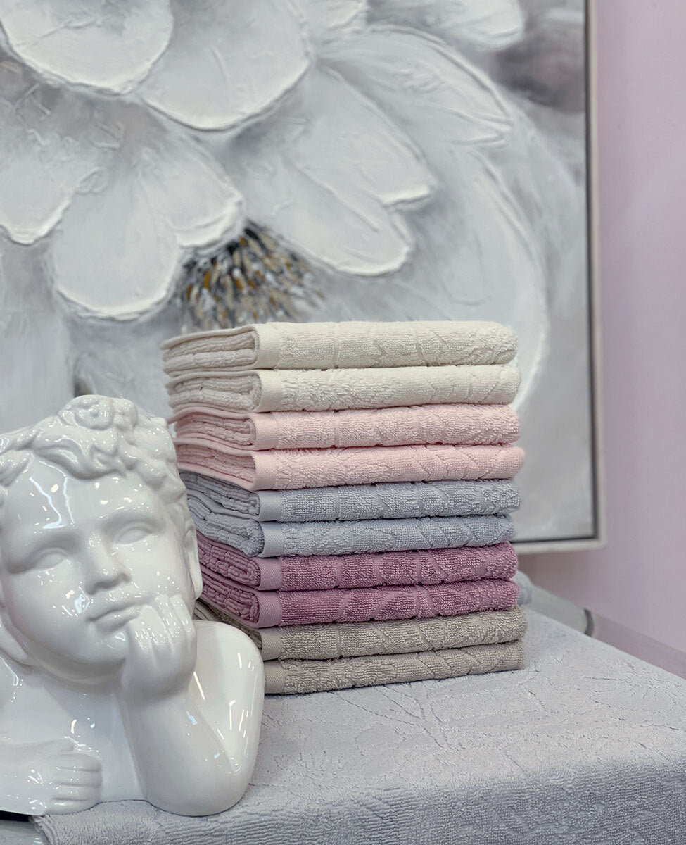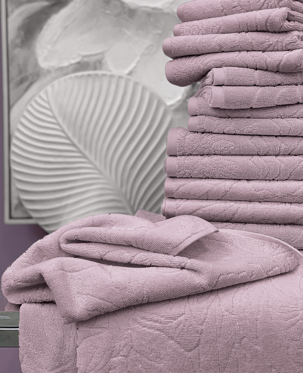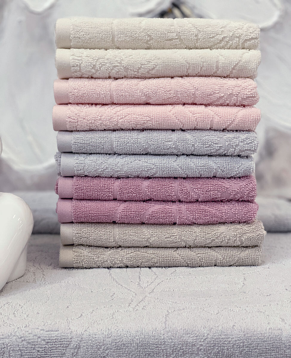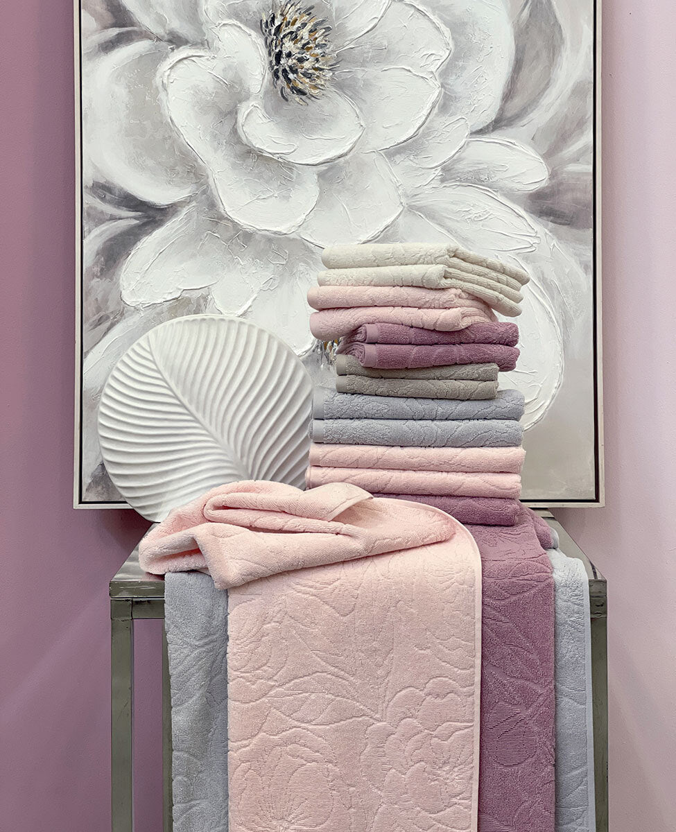 Coppia 1+1 di asciugamani in spugna di cotone tinta unita con motivo floreale piazzato in jacquard.
