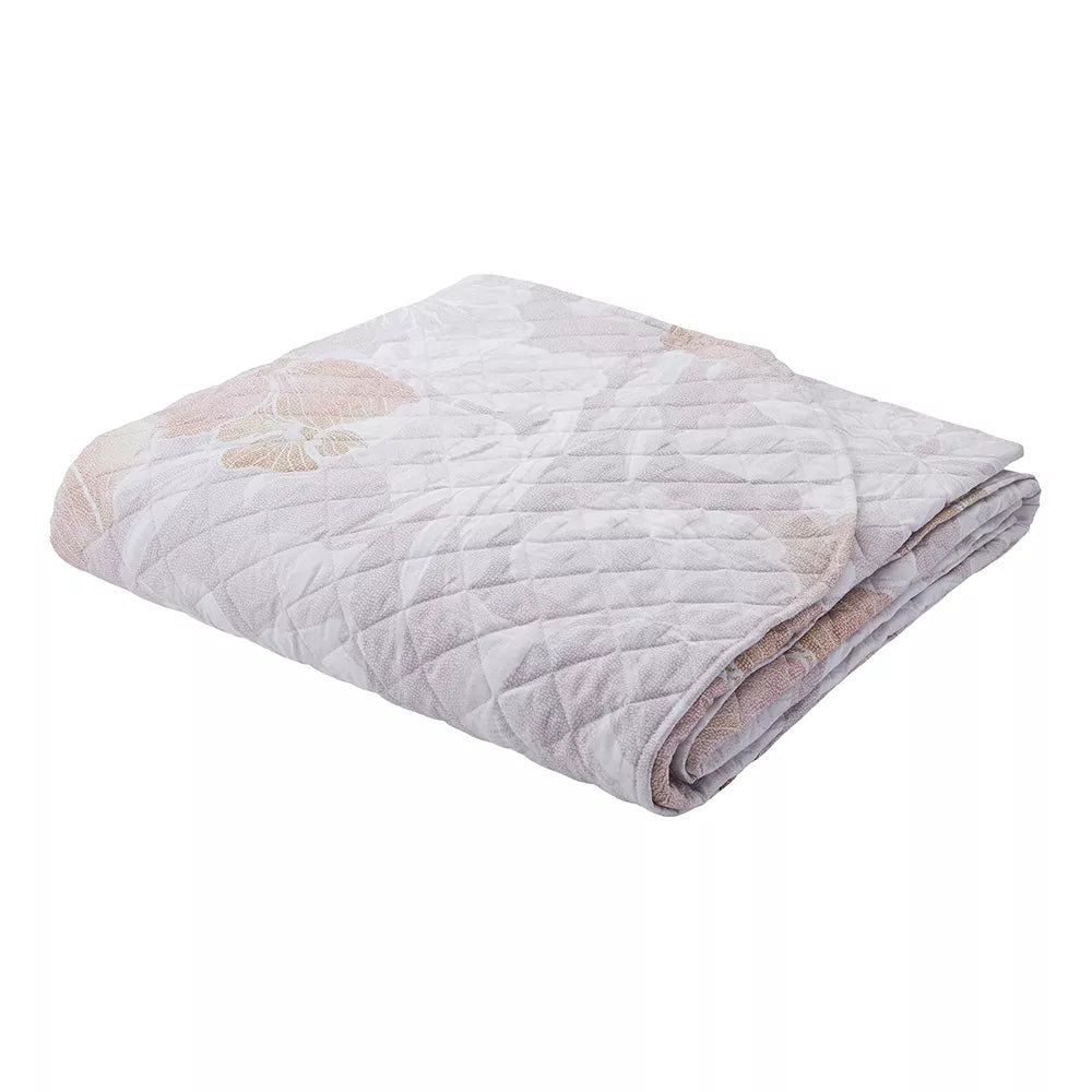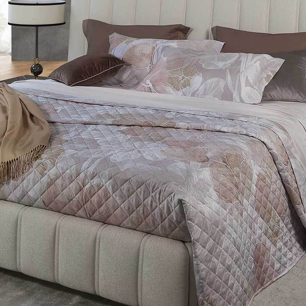 La trapunta primaverile Flower è caratterizzata da una fantasia floreale dai toni delicati, con fiori color albicocca e fondo grigio/beige con la tipica stampa Borbonese a occhio di pernice.